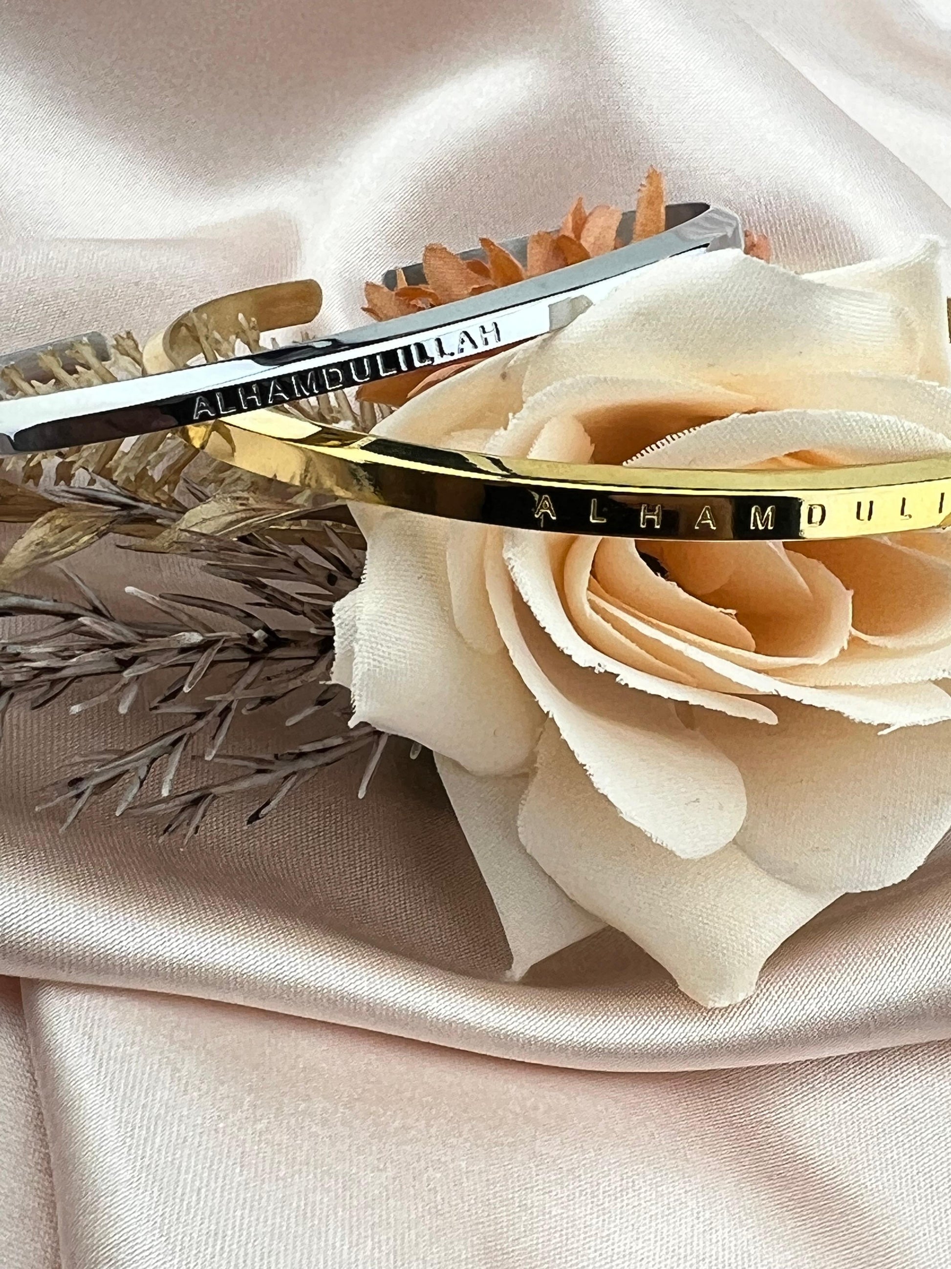 Korte beschrijving: Armband met 'Al Hamdulillah' inscriptie, stijlvol en tijdloos.