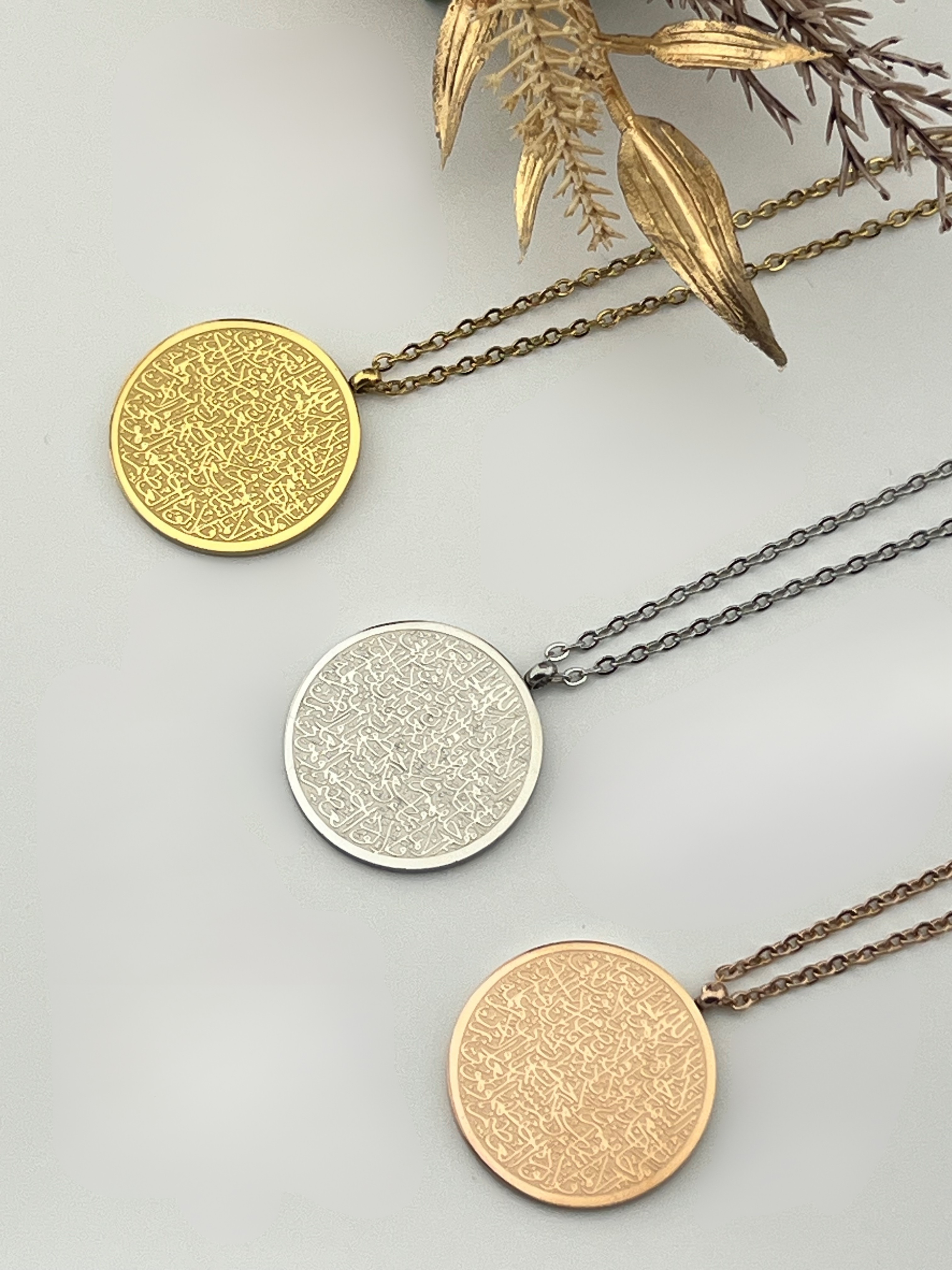 Korte beschrijving: Ayatul Kursi ketting in volle maan medaillon, sierlijk en betekenisvol.