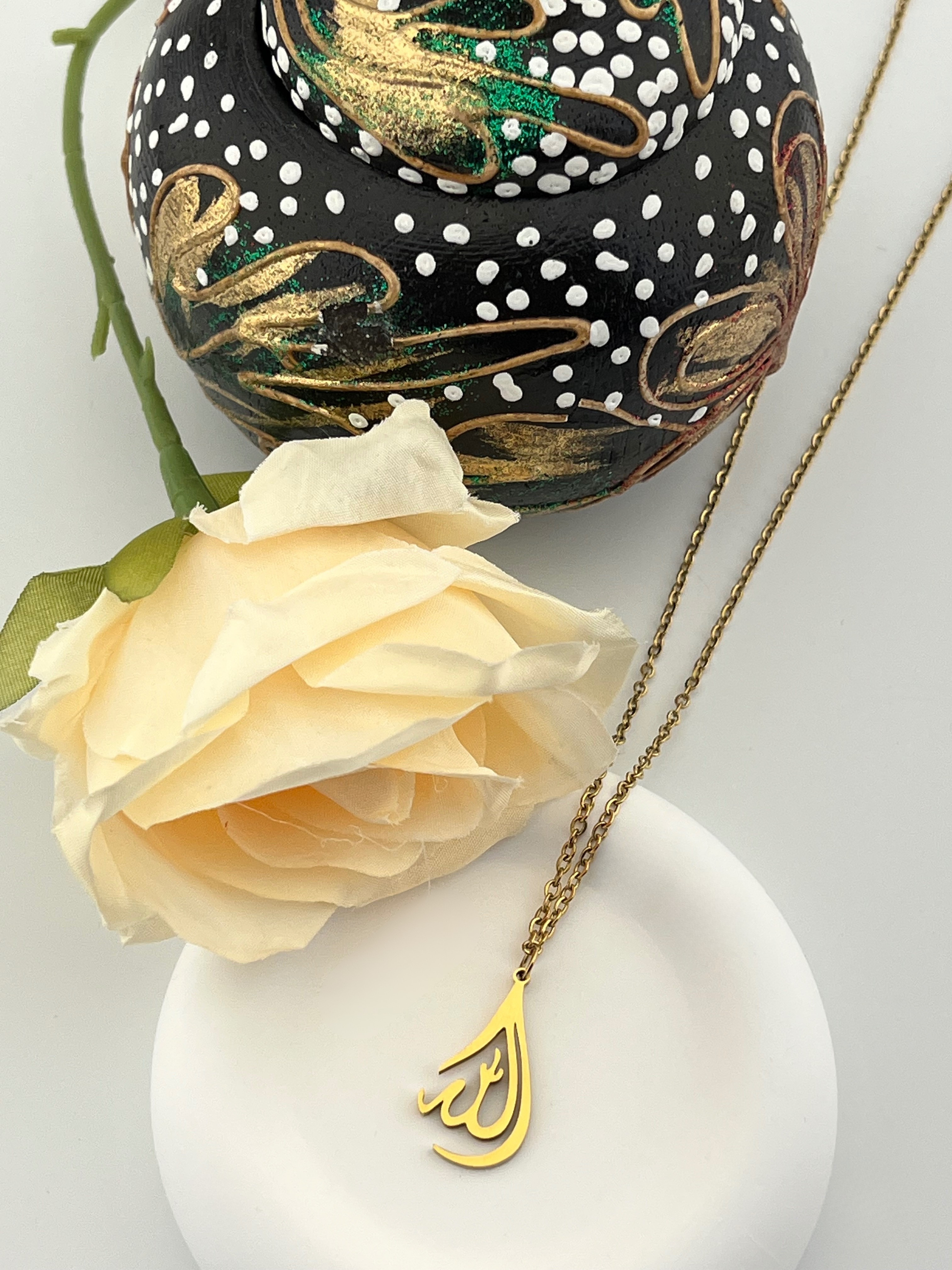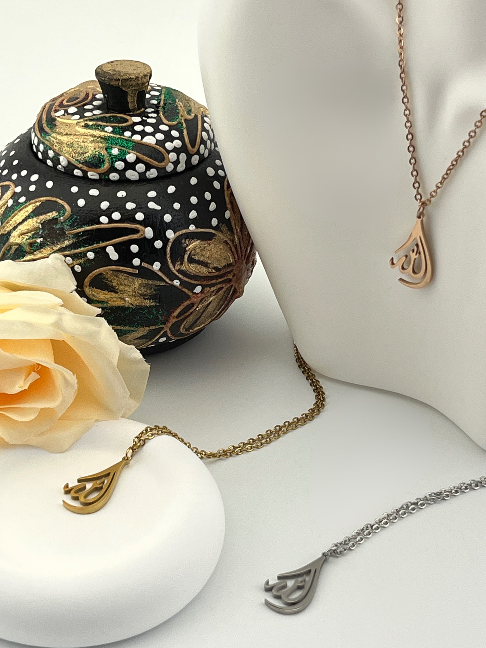 Deze sierlijke ketting is nu beschikbaar in drie prachtige kleuren: goud, rosé en zilver. De hanger, met de ingewikkelde Arabische kalligrafie van "Allah" (God), roest elegant aan een duidelijke ketting. Dit tijdloze sieraad is perfect voor dagelijks gebruik van speciale gelegenheden en straalt een diepe spirituele betekenis uit. De gedetailleerde afwerking en flexibele textuur maken dit tot een waardevolle toevoegingen aan elke sieradencollectie. Het is een prachtig geschenk voor geliefden of een bijzondere manier om je eigen geloof te uiten.